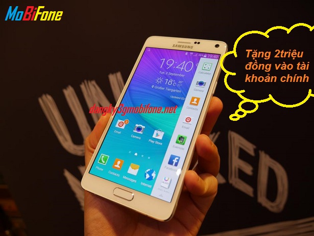 Từ ngày 01/12/2014, MobiFone dành tặng các khách hàng thân thiết chương trình ưu đãi hấp dẫn khi mua máy điện thoại Samsung Galaxy Note 4. Chương trình dành cho tất cả khách hàng cá nhân, khách hàng doanh nghiệp hiện đang sử dụng dịch vụ của MobiFone và các khách hàng hòa mạng mới.