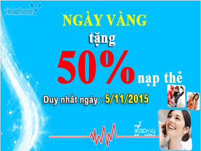 Đến hẹn lại lên, Vinaphone khuyến mãi 50% giá trị thẻ nạp ngày 5/11/2015 cho toàn bộ thuê bao trả trước đang hoạt động trên toàn quốc ( áp dụng Ezcom). Ngay sau khi nhận được thông báo này khách hàng hãy nhanh tay nạp card cho thuê bao của mình nhé, nạp nhiều hưởng nhiều để có thể thỏa sức vi vu đăng ký 3g vinaphone hay sử dụng đăng ký các gói gọi nội mạng và nhắn tin cho người thân, bạn bè tẹt ga rồi đó.